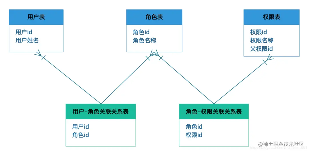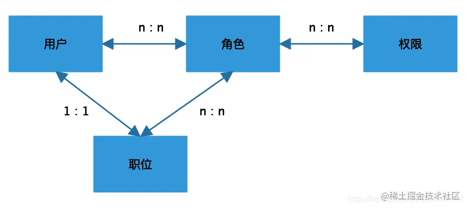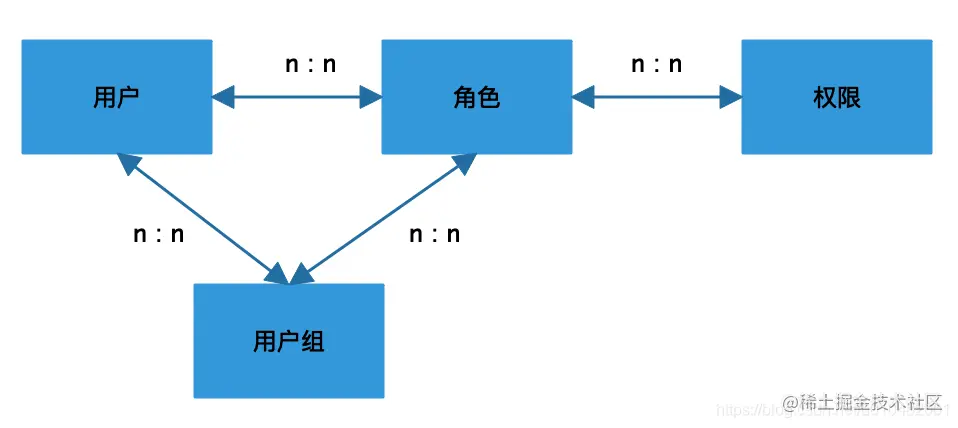 这就是经典的RBAC模型了(role-based-access-control),在这里面角色起到了桥梁左右,连接了用户和权限的关系,每个角色可以拥有多个权限,每个用户可以分配多个角色,这样用户就拥有了多个角色的多个权限。