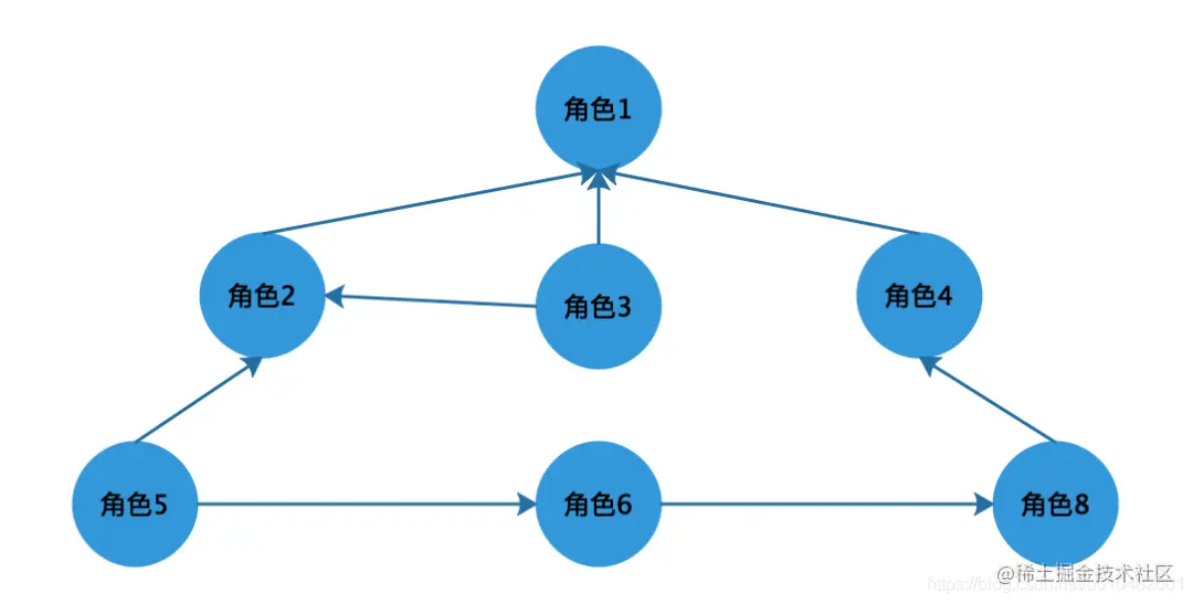 还有一种关系是下级角色可以拥有多个上级角色,上级角色也可以拥有多个下级角色,这种结构用图形表示是一个有向无环图,如下图所示: