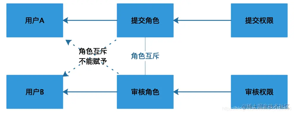 比如我们给一个用户赋予了会计的角色就不能同时再赋予审核员的角色,如果想拥有审核员的角色就必须先去掉会计的角色。假设提交角色和审核角色是互质的,我们可以用图形表示: