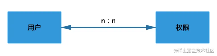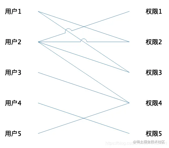 权限结构梳理清晰之后,需要思考怎么把权限分配给用户,用户少的情况下,可以直接分配,一个用户可以有多个权限,统一一个权限可以被多个用户拥有,用户-权限的模型结构如下所示: