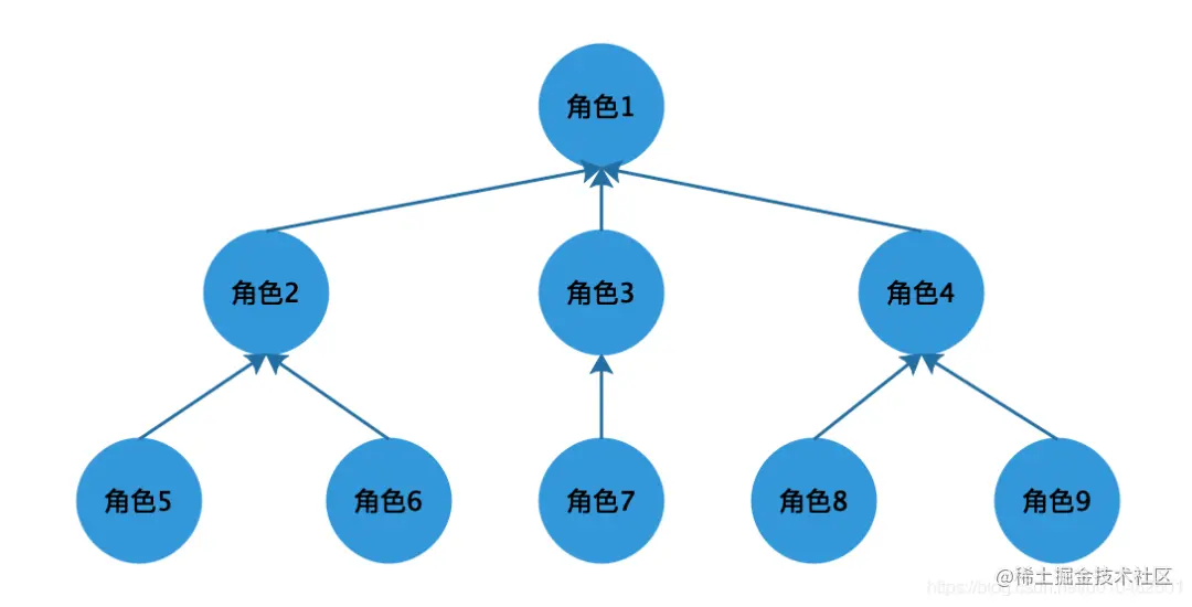 从模型图中可以看出下级角色拥有的权限,上级角色都拥有,并且上级角色可以拥有其他的权限。角色的层级关系可以分为两种,一种是下级角色只能拥有一个上级角色,但是上级角色可以拥有多个下级角色,这种结构用图形表示是一个树形结构,如下图所示: