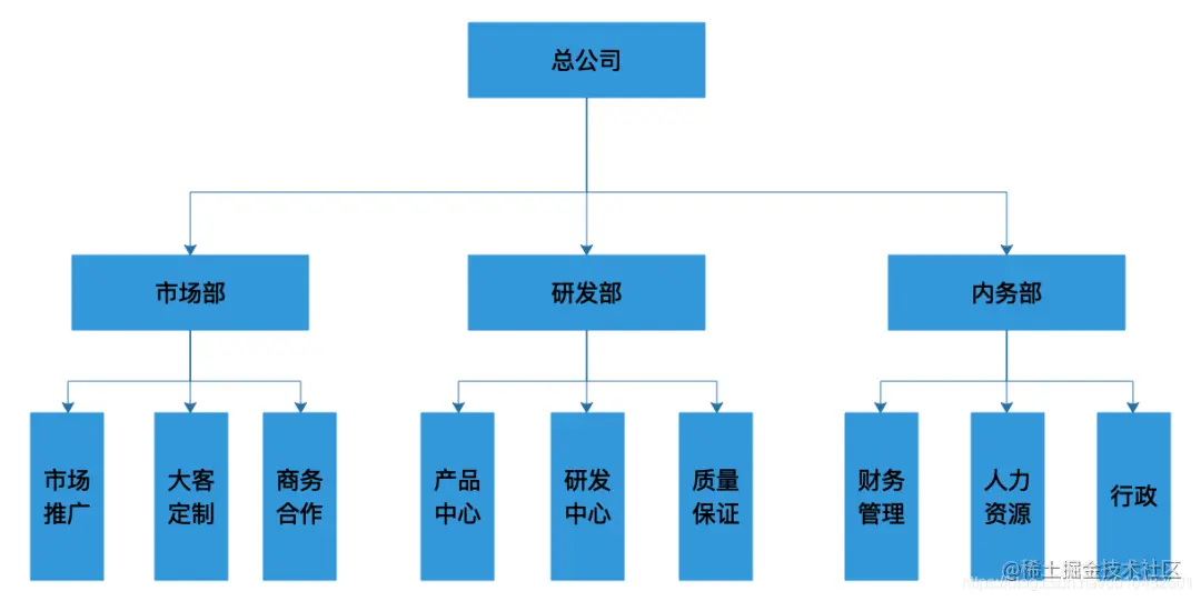 每个公司都有自己的组织架构,很多时候权限的分配可以根据组织架构来划分。因为同一个组织内的小伙伴使用的大部分权限是一样的。如下所示一个公司的组织架构图: