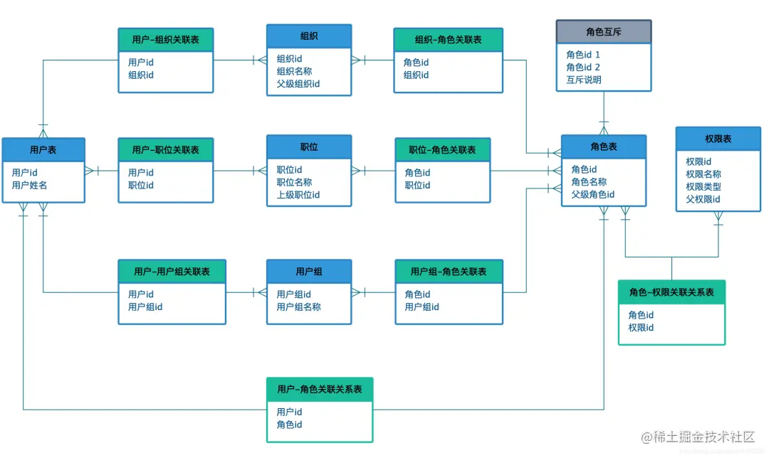 这里面需要强调的是角色互斥表,互斥的关系可以放在角色上,也可以放在权限上,看实际工作的需求。