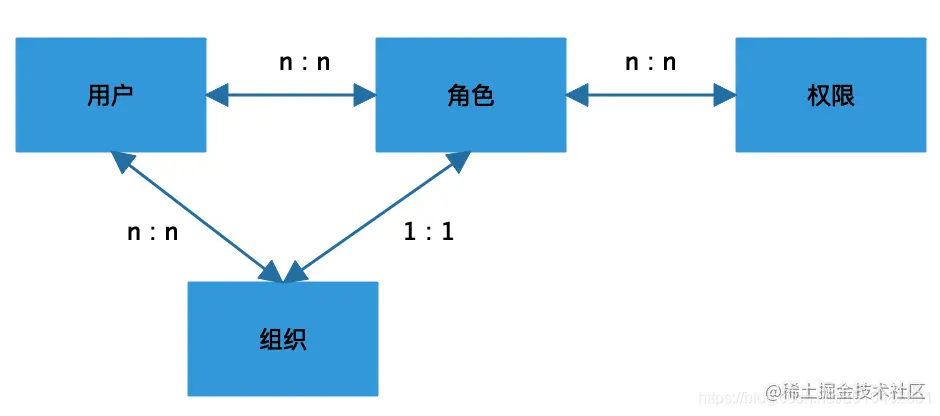 用户可以在多个组织中,因为组织也有层级结构,一个组织里只可以有多个用户,所以用户和组织的关系是多对多的关系,组织和角色的关系是一对一的关系。这个在工作中可以根据实际情况来确定对应关系。