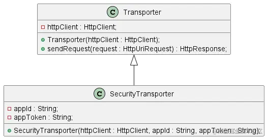 比如说,父类 Transporter 使用 org.apache.http.HttpClient 类来传输网络数据,子类 SecurityTransporter 继承父类 Transporter,重写 sendRequest() 方法,增加额外的功能,支持传输 appId 和 appToken 安全认证信息,如下图所示: