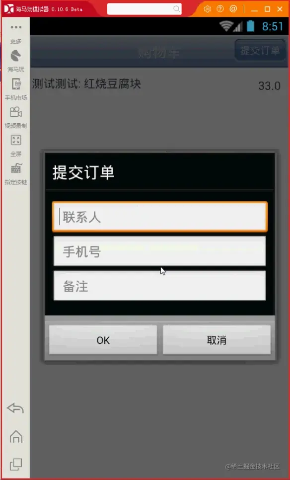 点击“添加到购物车”后,在菜品界面点击menu,点击“购物车”,进入下订单界面。如下图所示: