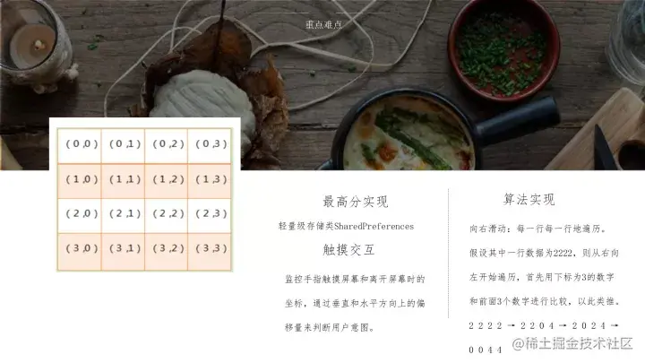 分数显示:每当有合并时,便将合并所得数字累计到当前分数上,并且比较当前数字和最高分,如果当前得分大于最高分,则更新最高分。