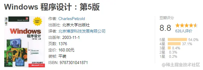 《Windows程序设计(第5版 珍藏版)》这本书其实是工作后做项目的时候才开始看的,这本书主要介绍 Window 系统桌面软件的开发,作为 Windows 开发人员的必备参考,涵盖基础知识和中高级主题,全面地介绍了 Windows 程序设计所涉及的细枝末节,想了解和从事这方面开发的同学可以看看。看过这本书,你会对你电脑上用到的软件有一个更深的体会。窗口是怎么出来,菜单点击后是怎么处理的,动画是怎么绘制的,软件又是怎么和操作系统通信的,看完这本书你通通都会知道。