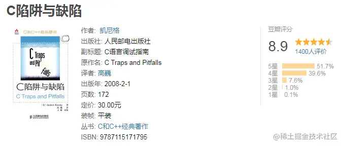 《C陷阱与缺陷》 正如书上所说,“本书所揭示的知识,至少能够帮助你减少 C 代码和初级 C++ 代码中 90% 的 Bug”,看完后可以避免 C 语言开发的一些坑。