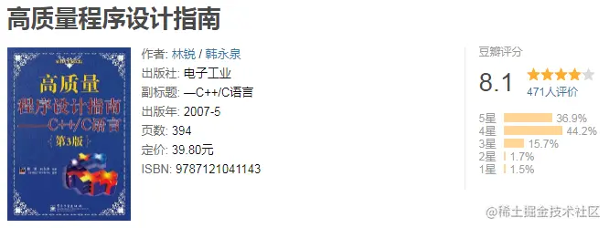 《高质量程序设计指南》,墙裂推荐,这本书看得比较过瘾,书里面有一些编程规范的东西,对于写程序的人来说,还是不错的,可以培养好的编码习惯,加深了一些知识的巩固。比较实用,也适合面试前看看。