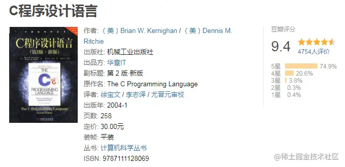第一本书《C程序设计语言》,机械工业出版社,作者Brian W. Kernighan / (美)Dennis M. Ritchie。C 语言之父写的,入门经典书籍。
