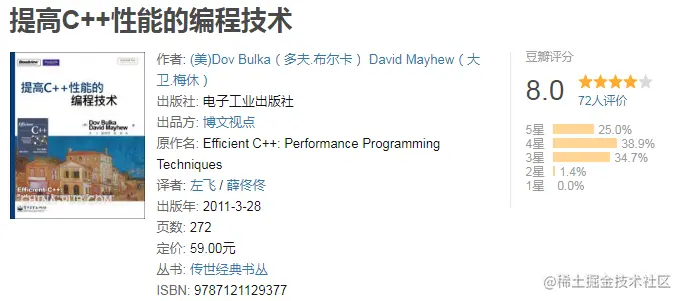 《提高C++性能的编程技术》,本书认为 20% 的性能缺陷将会占用我们 80% 的时间。因此我们把精力集中在最有价值的地方。本书详细讨论了临时对象、内存管理、继承、虚函数、内联、引用计数以及 STL 等一切有可能提升 C++ 效率的细节内容。无论你是相关领域的从业人员,还是 C++ 程序设计爱好者,或者是渴望突破编程瓶颈、大幅提升自我修为的程序设计爱好者,本书都必将使你获益良多。