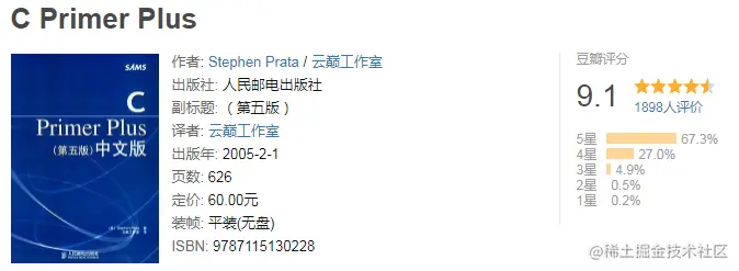 《C Primer Plus》 ,人民邮电出版社,作者 Stephen Prata。 可以作为 C 语言工具书,也可以作为入门,内容循序渐进,能够锻炼编程思想。