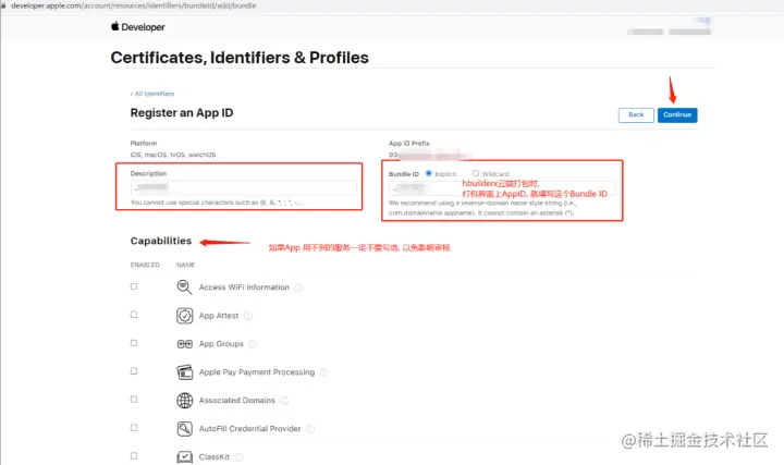 2.4填写Bundle ID,点击继续,这个Bundle ID就是HbuilderX打包时打包界面上的AppID,并填写这个Bundle ID。