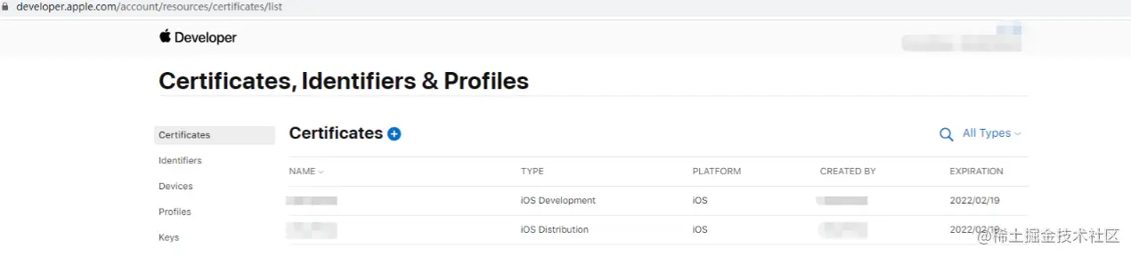 2.点按Apple Certificate以添加新证书(键入:开发证书,选择开发,并颁发证书,选择分发)。