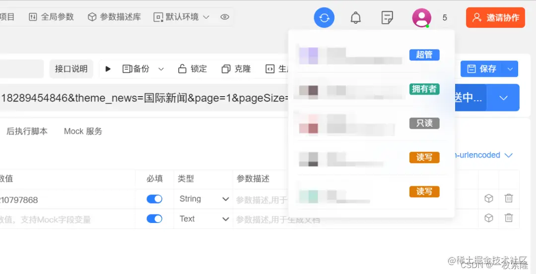 Apipost一直在宣传他们的协作功能,于是我拉了几个同事浅试了一下,感觉比想象中更好一些。一开始我以为的协作就是各做各的,然后接口互相覆盖,但其实他们已经做到实时协作这个程度了,而且让人眼前一亮的是协作人员的在线状态和权限也可以在工作台里展示,这点不管是对于管理层还是协作者来说都很方便,感觉Apipost还是很能站在用户角度想问题的。