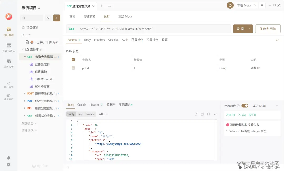 和Apipost一样,Apifox也有一个示例项目。不过他是文档先行,想调试接口得先写份文档,操作起来有些繁琐,而且这个tab老跳总感觉不太稳定,想改参数还得来回切(顺便,这里提个小BUG,我这新用户一进去默认就是测试环境,最基本的接口发送都没成功,按理说示例项目不该有这样的问题,上线前你们都不测试的吗?)
