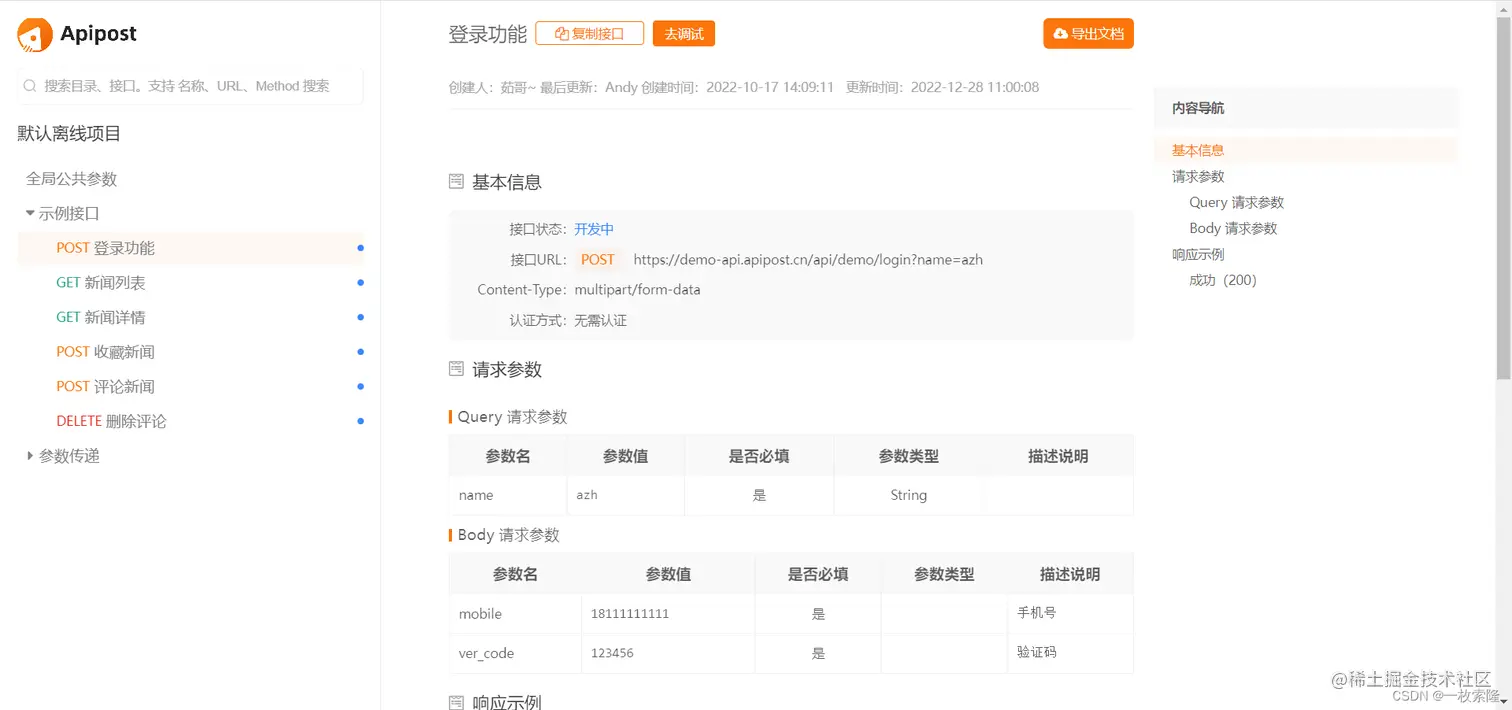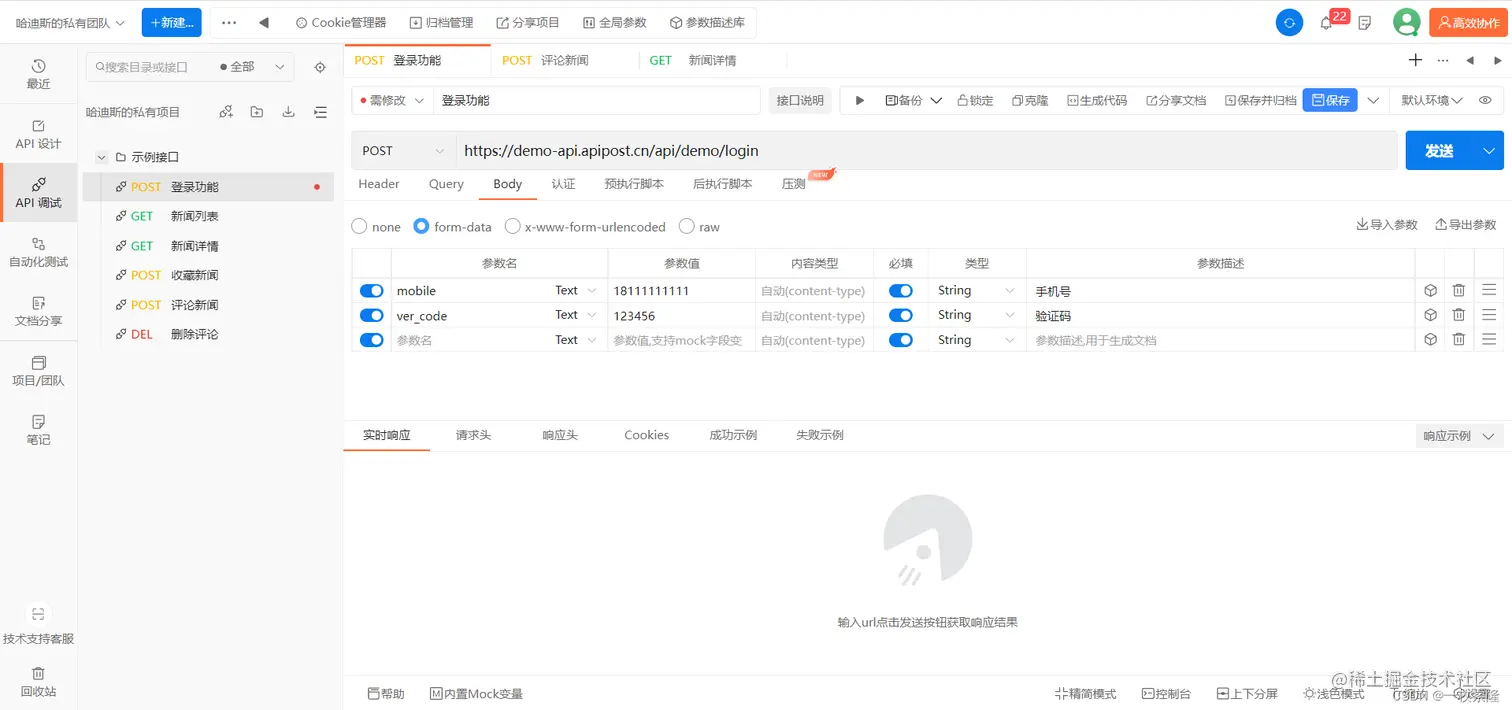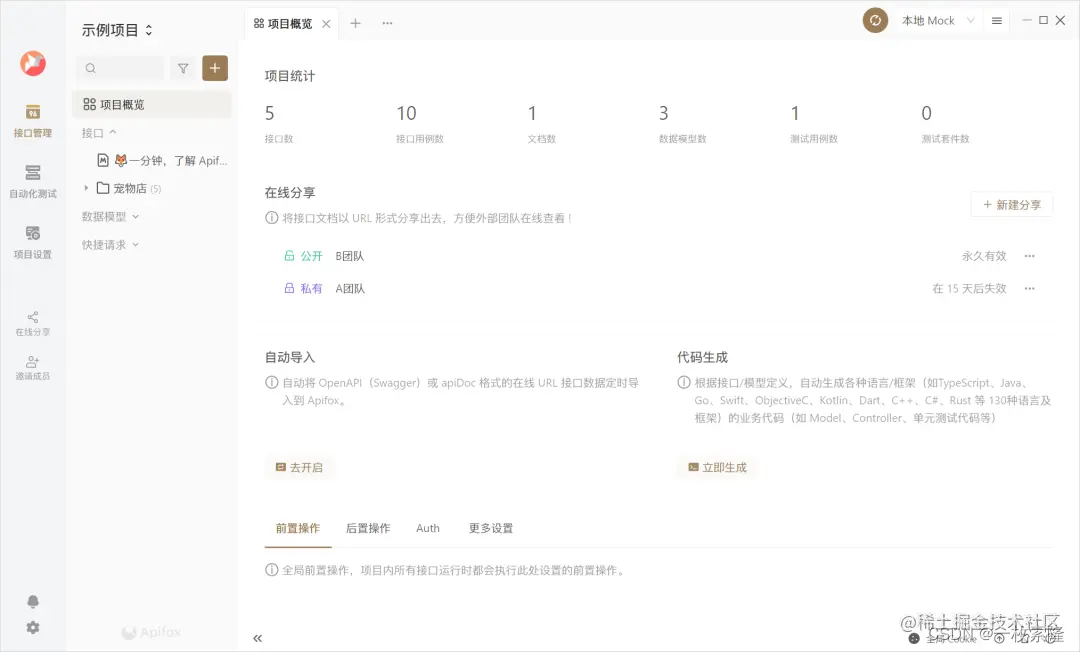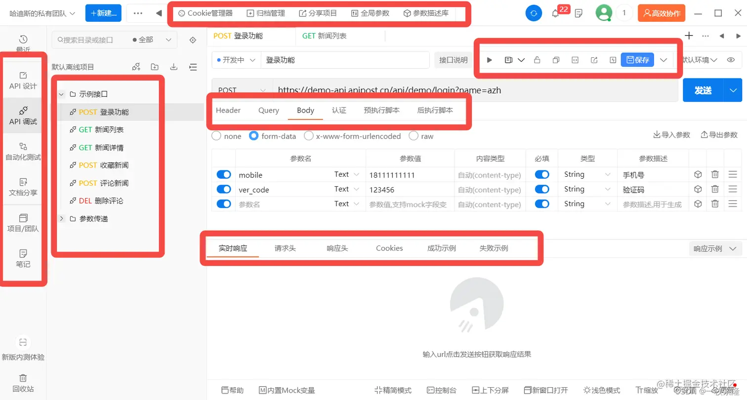 这界面设计可以说是开箱即用了,新用户进去后有一个默认的示例项目,这点挺好的,比较方便理解。平常调试接口、写参数、分享文档这些高频重要操作都非常好找,而且实操起来也很好上手。