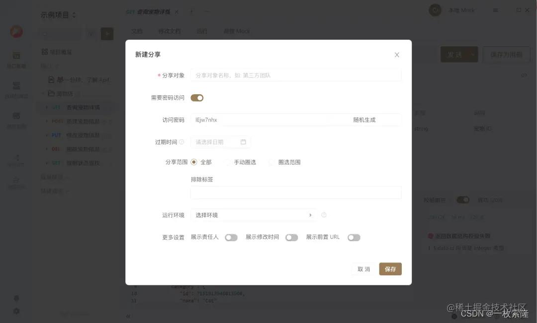 他这个功能藏得有点深,一开始我还以为不支持分享功能,找了找发现在左边菜单栏的下面置灰了。而且分享前也要先填一堆设置项,感觉Apifox整个软件的操作逻辑都是这样,你想做什么事情都得先填个问卷才行,实操起来有点难受。
