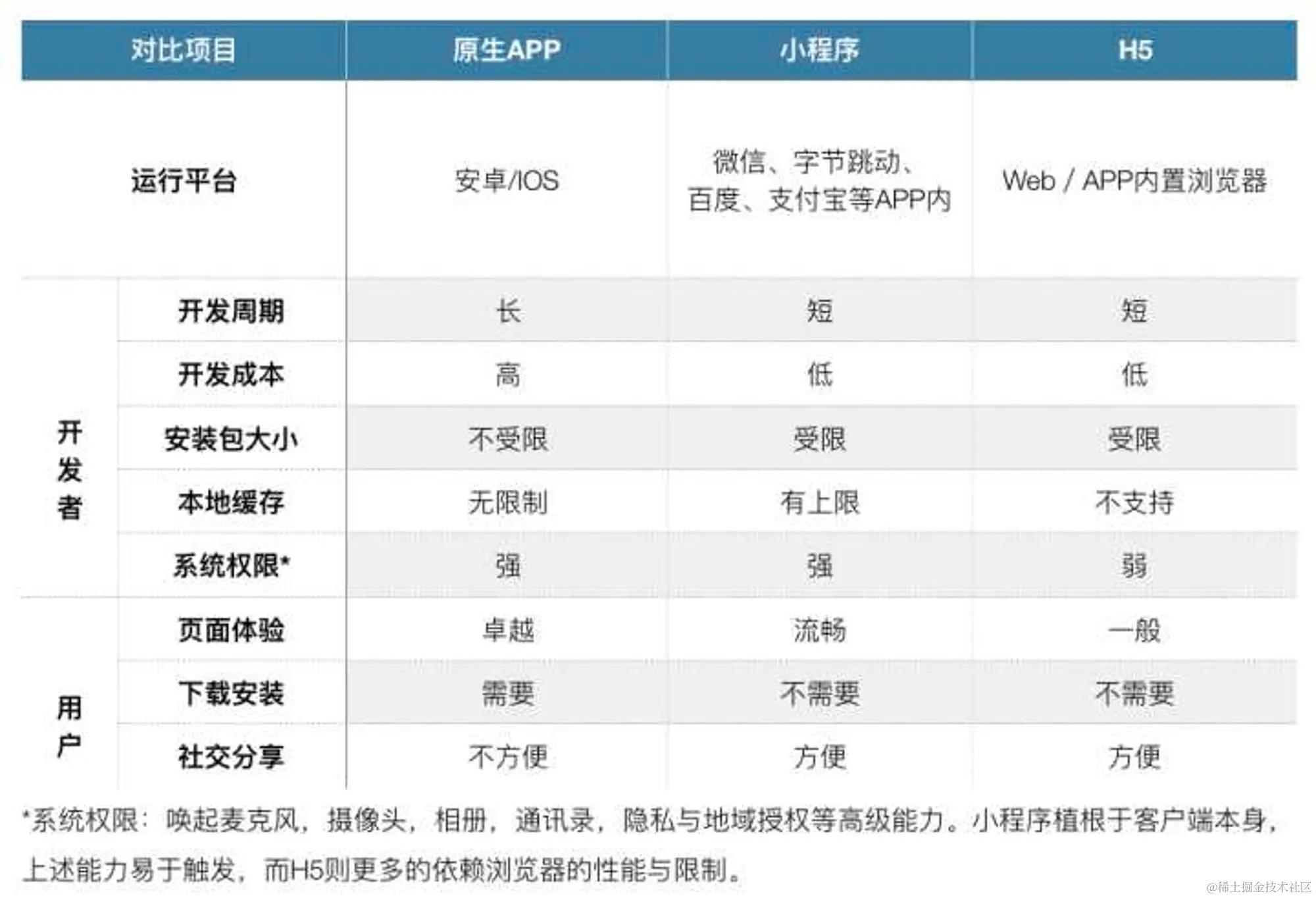 具体优劣对比,请参见下表:▲上图:小程序、APP、H5优劣比较成本效益开发迅捷,成本可控,快速上线。更适合当下快速敏捷迭代的用户体验语境。且可完全满足中小企业的电商与预算需求。具体优劣对比,上表亦列明。精准分发小程序已被各大平台融入其战略生态,依托于平台自身流量优势,受众调性与用户属性细分完成精准分发,高效提升转化率。即看即买可直接作为自然搜索、广告投放、内容营销落地页,实现即看即买的电商体验(优于H5)。内容营销内容是驱动转化的重要工具,将小程序作为内容变现的重要载体,显著减少落地页跳转带来的流量损失。