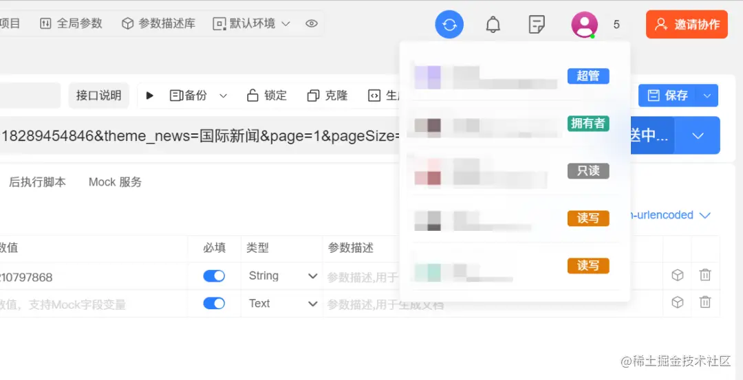Apipost一直在宣传他们的协作功能,于是我拉了几个同事浅试了一下,感觉比想象中更好一些。一开始我以为的协作就是各做各的,然后接口互相覆盖,但其实他们已经做到实时协作这个程度了,而且让人眼前一亮的是协作人员的在线状态和权限也可以在工作台里展示,这点不管是对于管理层还是协作者来说都很方便,感觉Apipost还是很能站在用户角度想问题的。
