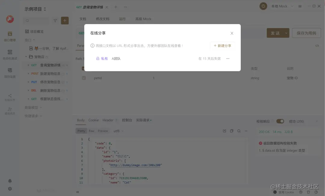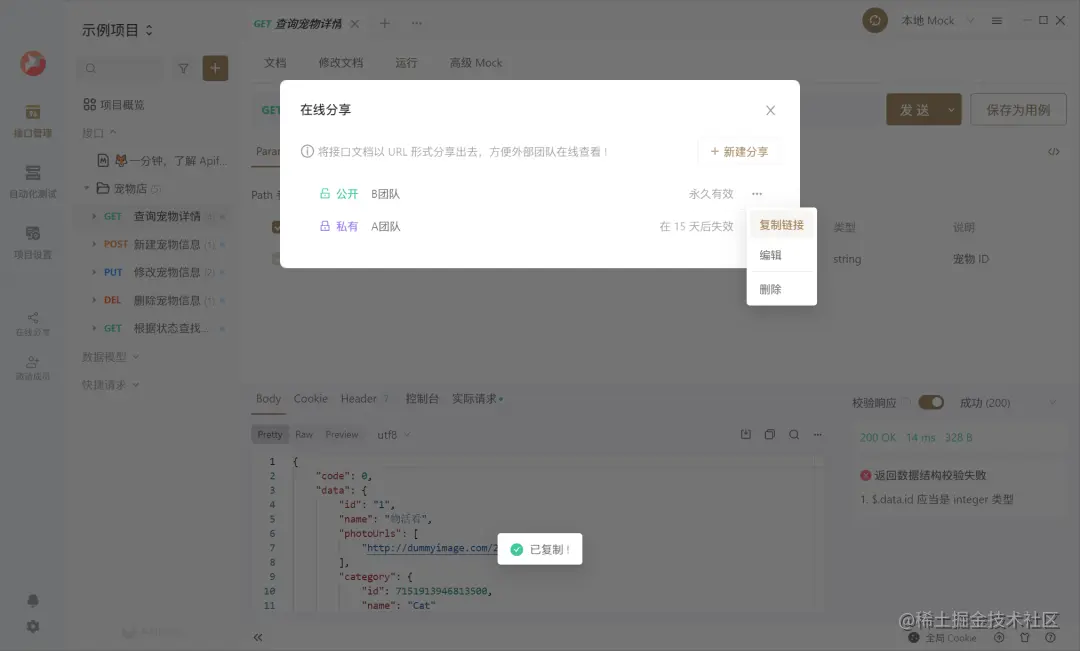 支持自定义公开/私密;支持设置文档有效期;支持自定义接口分享。
