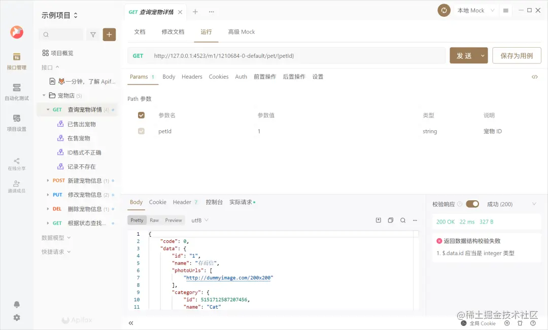 和Apipost一样,Apifox也有一个示例项目。不过他是文档先行,想调试接口得先写份文档,操作起来有些繁琐,而且这个tab老跳总感觉不太稳定,想改参数还得来回切(顺便,这里提个小BUG,我这新用户一进去默认就是测试环境,最基本的接口发送都没成功,按理说示例项目不该有这样的问题,上线前你们都不测试的吗?)