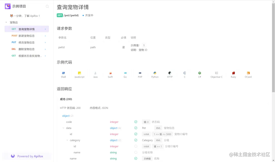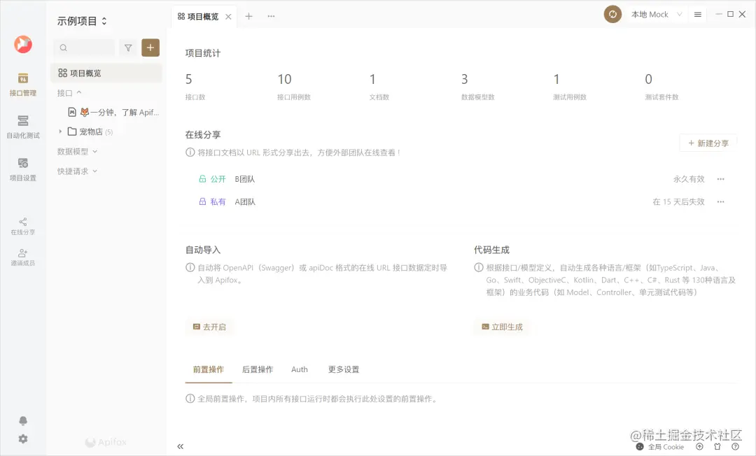 这界面设计可以说是开箱即用了,新用户进去后有一个默认的示例项目,这点挺好的,比较方便理解。平常调试接口、写参数、分享文档这些高频重要操作都非常好找,而且实操起来也很好上手。