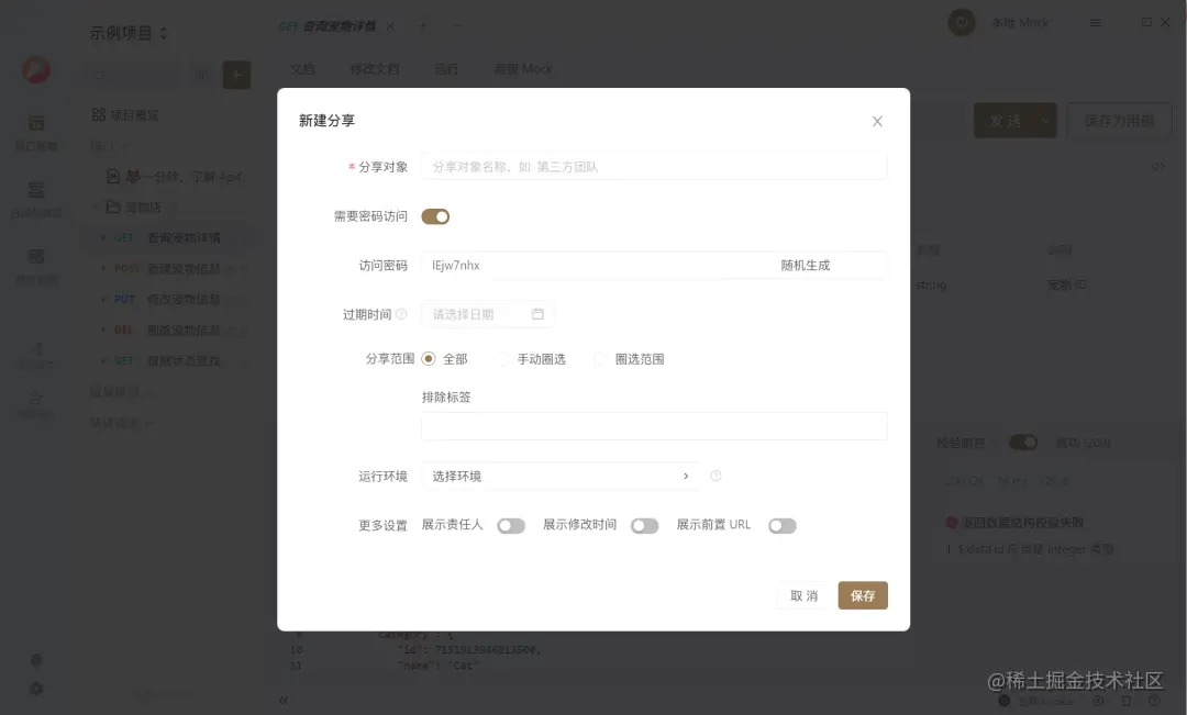 他这个功能藏得有点深,一开始我还以为不支持分享功能,找了找发现在左边菜单栏的下面置灰了。而且分享前也要先填一堆设置项,感觉Apifox整个软件的操作逻辑都是这样,你想做什么事情都得先填个问卷才行,实操起来有点难受。