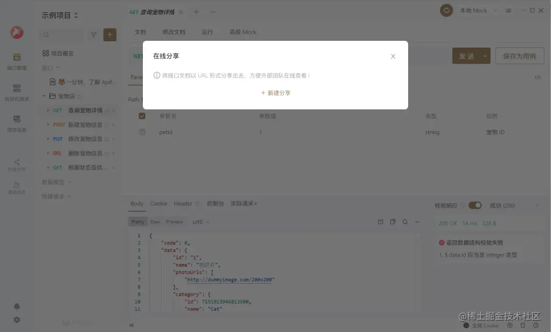 他的分享功能就在主页面里,一个是单接口分享,一个是整个项目分享,一共需要两步就可以完成操作。而且写这篇文章的时候发现他还支持自定义分享,可以跨目录点选接口,这点挺不错的,分享起来很灵活。