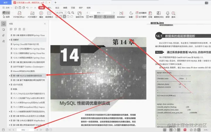 第14章MySQL性能调优案例实战, 对数据库进行性能调优可以提升海量数据的访问速度,而海量数据的存取问题也是高并发系统必然要面对的问题。本章先讲解数据库的一些底层原理,这些原理是后续数据优化的理论基础。然后通过案例演示如何对数据访问进行优化,从而提升数据的访问性能。海量数据最终需要通过Web技术进行展示,而本书赠送的配套资源“扩展/通过案例快速回顾Java Web核心技术.docx"中,就提供了一个完整的演示案例,读者可以阅读并复习相关数据展示的技术。