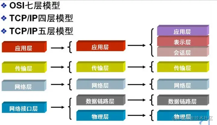 将所有的协议综合起来,各个层次的所有协议被称为协议栈。因特网的协议栈由5个层次组成:物理层、链路层、网络层、传输层和应用层。这个划分方法称为TCP/IP五层协议。除此之外,还有OSI七层模型和TCP/IP四层协议。它们之间的对应关系如下: