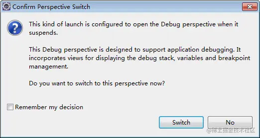 (3) 要以调试方式运行程序,需要在工具栏中单击“调试”按钮,这样执行到断点的位置时弹出如图 3 所示的对话框,可以发现将要执行的 for 语句已经变成了绿色。单击“Switch(是)” 按钮进入调试模式,如图 4 所示。