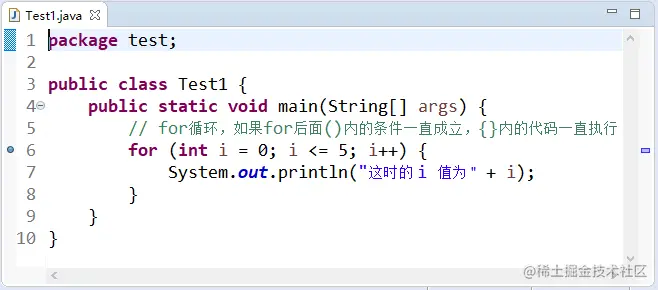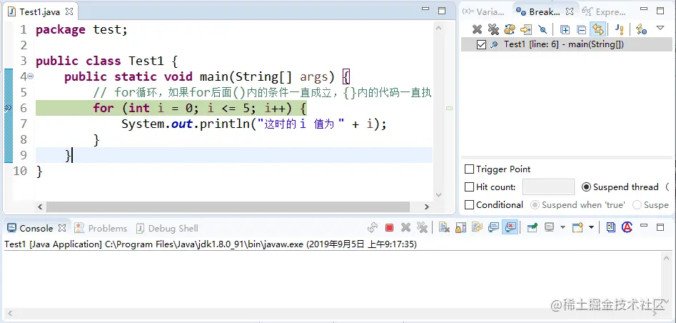 下面通过一个简单的例子来了解一下 Eclipse 调试程序的方法。上述代码完成的主要功能是如果 i 值满足小于或等于 5 的条件,就一直执行输出语句。可以看到 for 关键字后面的小括号中有三个表达式,第一个表达式int i=0的作用是定义一个 int 类型的变量并赋初值为 0,第二个表达式i<=5说明 i 要满足的条件是小于或等于 5,第三个表达式i++的意思是程序每执行一次 i 加 1。