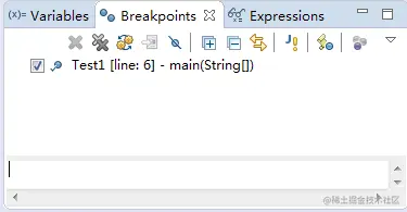 (2) 选择“Window(窗口)”|“Show View(显示视图)”|“(Breakpoints)断点”命令,打开“Breakpoint(断点)”窗格,在这里可以看到 Test 的第 6 行有一个断点,如图 2 所示。