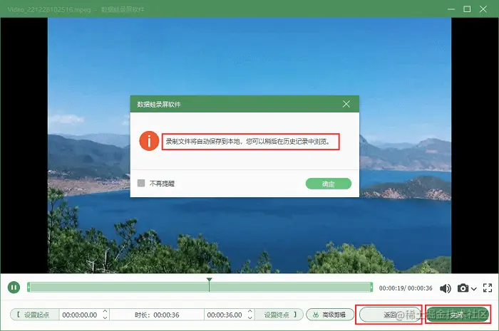 **步骤4:**录制课程结束后,可以在【预览窗口】观看课程视频。如果满意录制的课程视频,可以点击【完成】系统将会自动保存视频文件。此外,也可以在【历史记录】中浏览以往的视频文件。