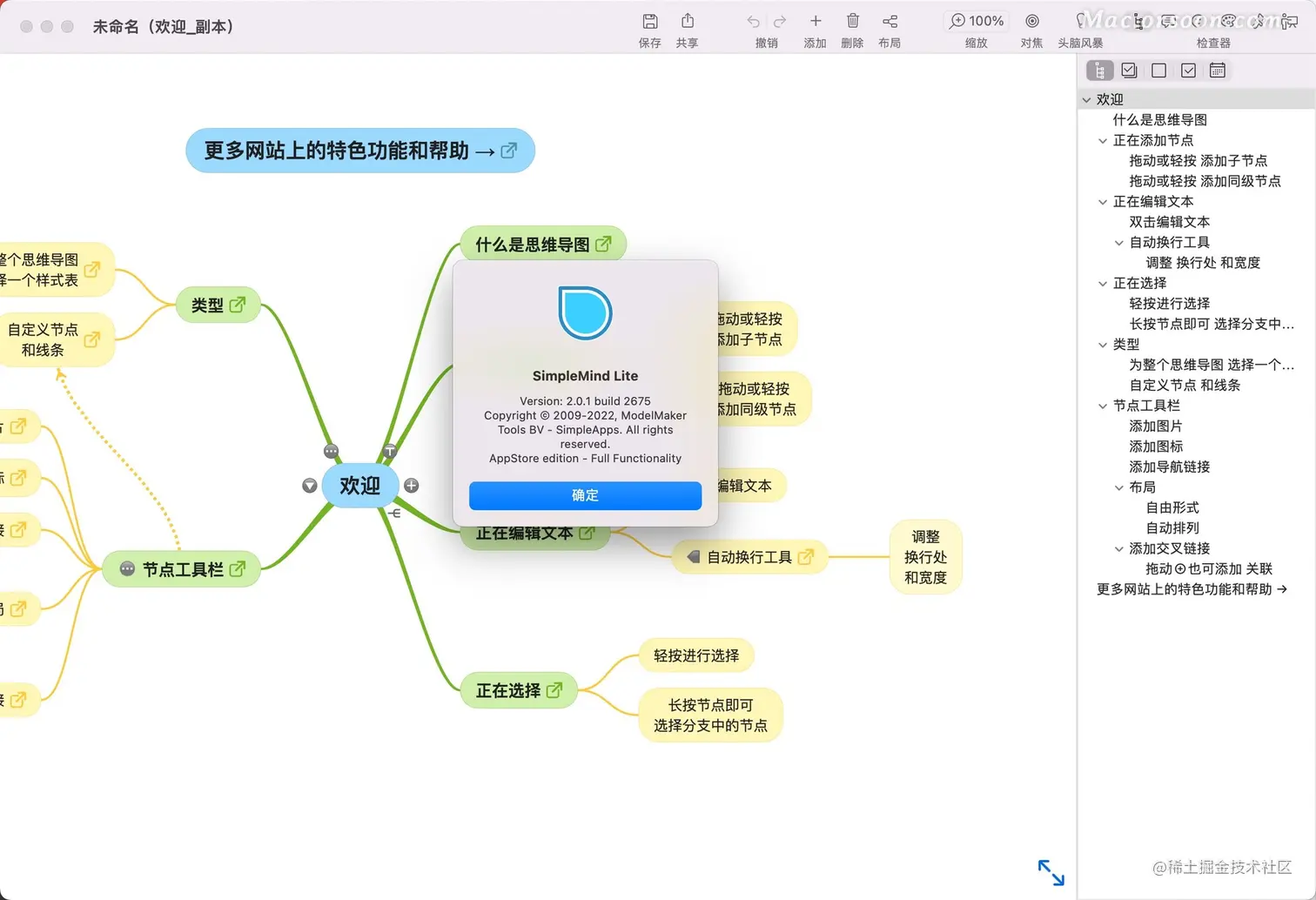 SimpleMind 是一款Mac上易用的思维导图工具,相比其他知名的MindManger、Xmind等思维导图软件,SimpleMind最大的特点是简洁易用,支持导出格式为PDF, PNG, HTML, TXT, OPML, Freemind等,可以在上下级节点插入多一级节点,很不错!