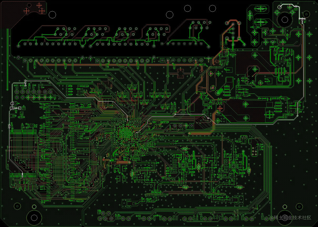 而在PCB layout图中,可以发现,DC/DC输出后,经过电感和电容整流,但输出电容和输入电容相隔比较远,中间又有电感挖空的区域,使得回流路径不太通畅。