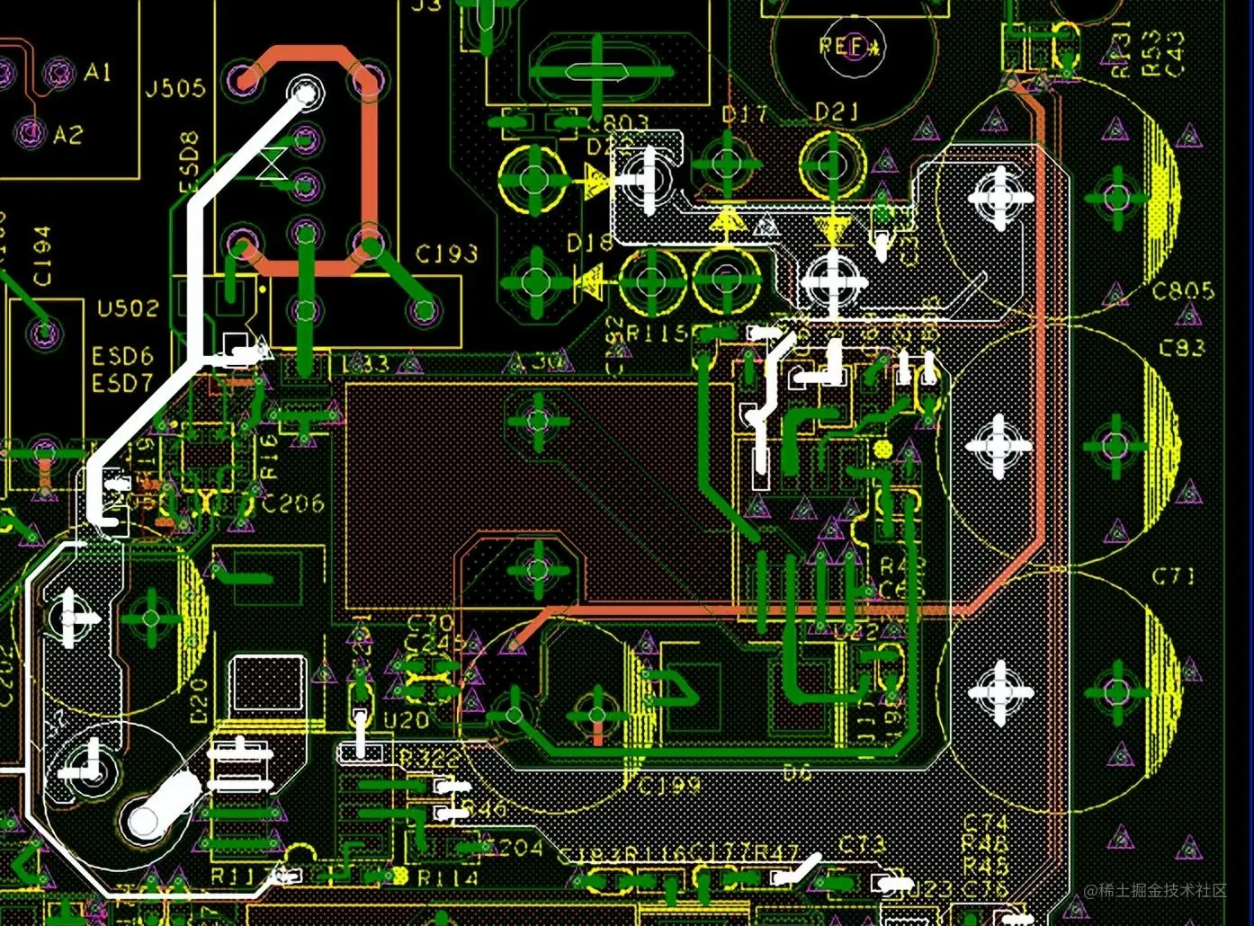 - 很多情况下,ESD问题是由于浮地设备的地电位变化引起的,因此,在ESD敏感区域,应当注意电源和地的去耦设计,以防止ESD引起地和电源的电位变化。