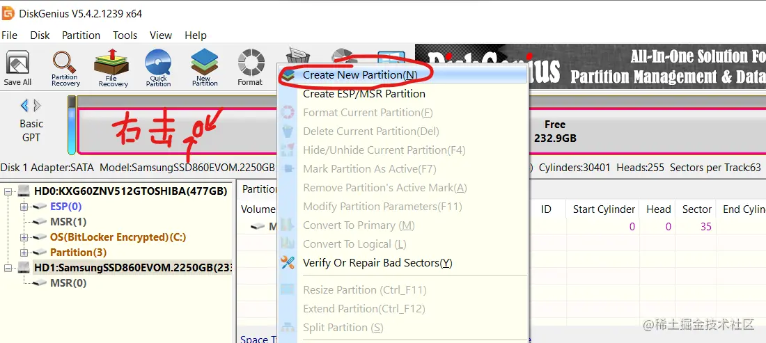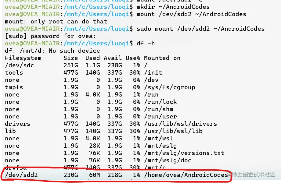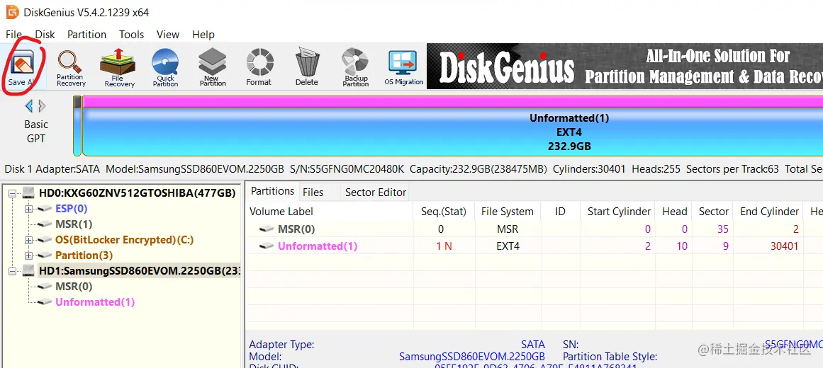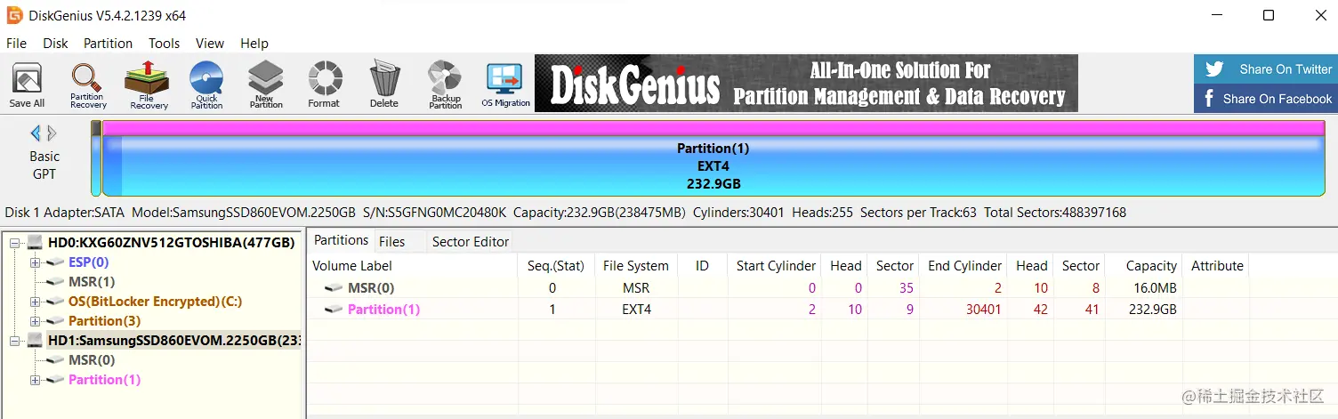 此处sdd1是msr分区,sdd2是我创建的新ext4分区,可以用 diskgenius 观察分区顺序