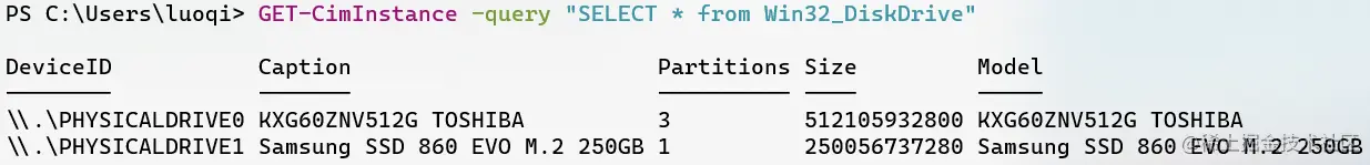 GET-CimInstance -query "SELECT * from Win32_DiskDrive"
