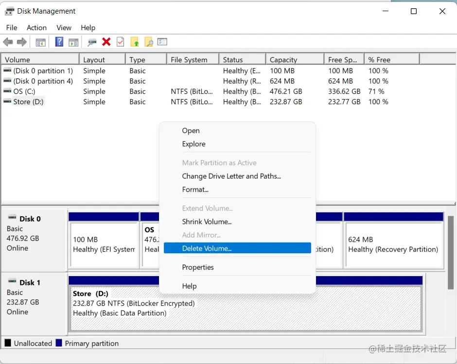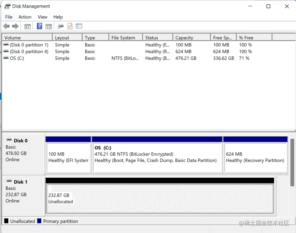 - 打开磁盘管理器,清空一个需要用于WSL 2的磁盘