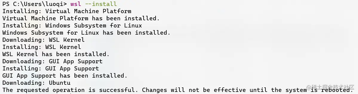 - 启用Linux子系统功能(需要管理员权限),下面这个指令可以自动配置好所有环境,默认使用WSL 2,Ubuntu系统。