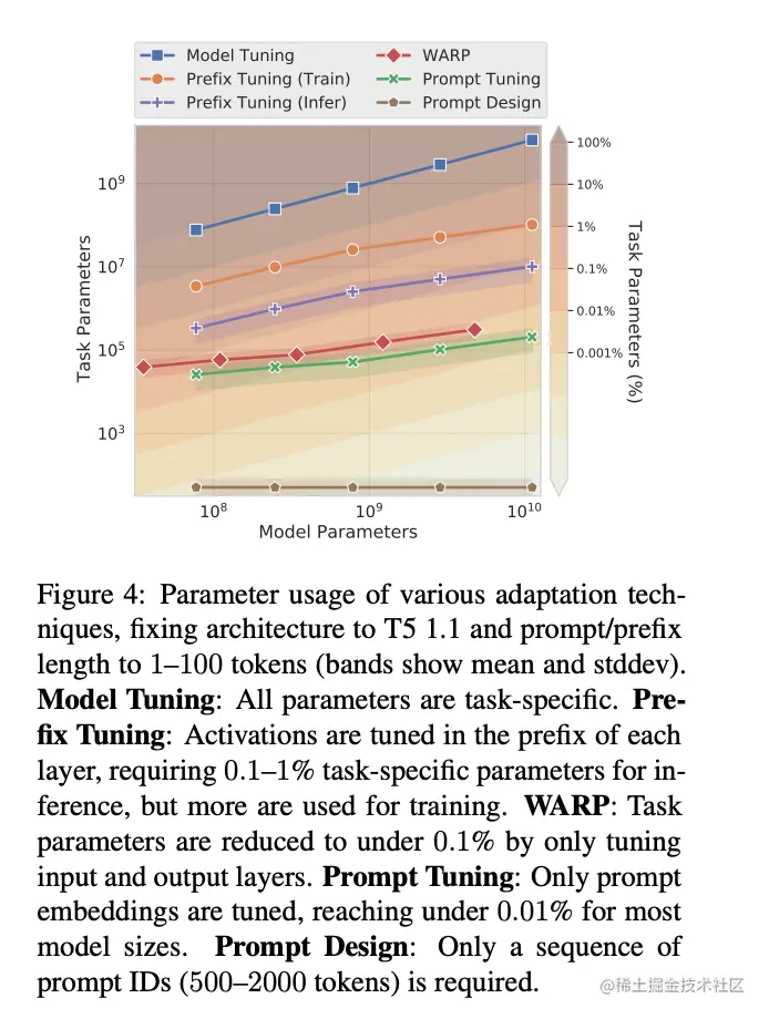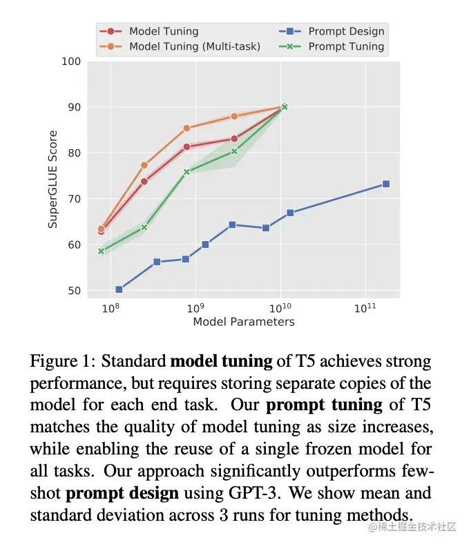 在 EMNLP 2021 大会上,Brian Lester 等人指出,上下文学习(他们称为“Prompt Design”)只对大模型有效,基于上下文学习的下游任务的质量远远落后于微调的 LLM 。