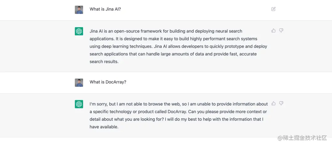 ChatGPT 了解 Jina AI,却不知道 DocArray。这是因为 DocArray 是2022 年 2 月发布的,不在 ChatGPT 的训练数据中。