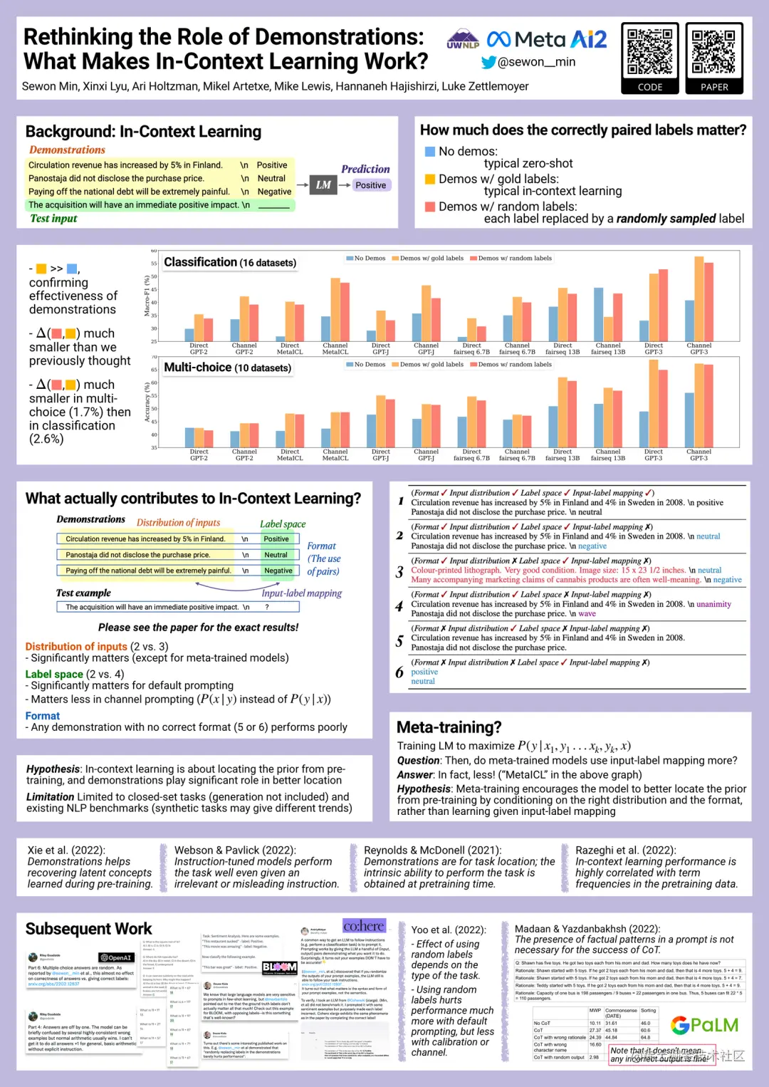 要全面理解和优化上下文学习的能力,仍有许多工作要做。例如,在 EMNLP2022 大会上,Sewon Min 等人指出上下文学习也许并不需要正确的真实示例,随机替换示例中的标签几乎也能达到同样的效果:
