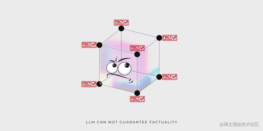 还是相同的插图,现在我们很明显就能看出为什么 LLM 不能保证生成结果的真实性。因为立方体的角表示的训练数据的真实性不能自动扩展到流形内的其他点,否则,就不符合逻辑推理的原则了。