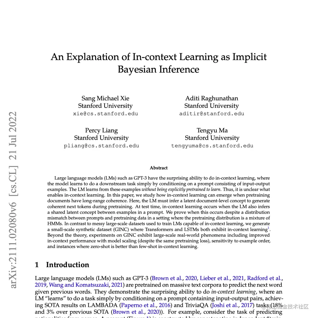 Sang Michael Xie 等人提出了一个框架,来理解语言模型是如何进行上下文学习的。根据他们的框架,语言模型使用提示来 "定位 "相关的概念(通过预训练模型学习到的)来完成任务。这种机制可以视作贝叶斯推理,即根据提示的信息推断潜概念。这是通过预训练数据的结构和一致性实现的。