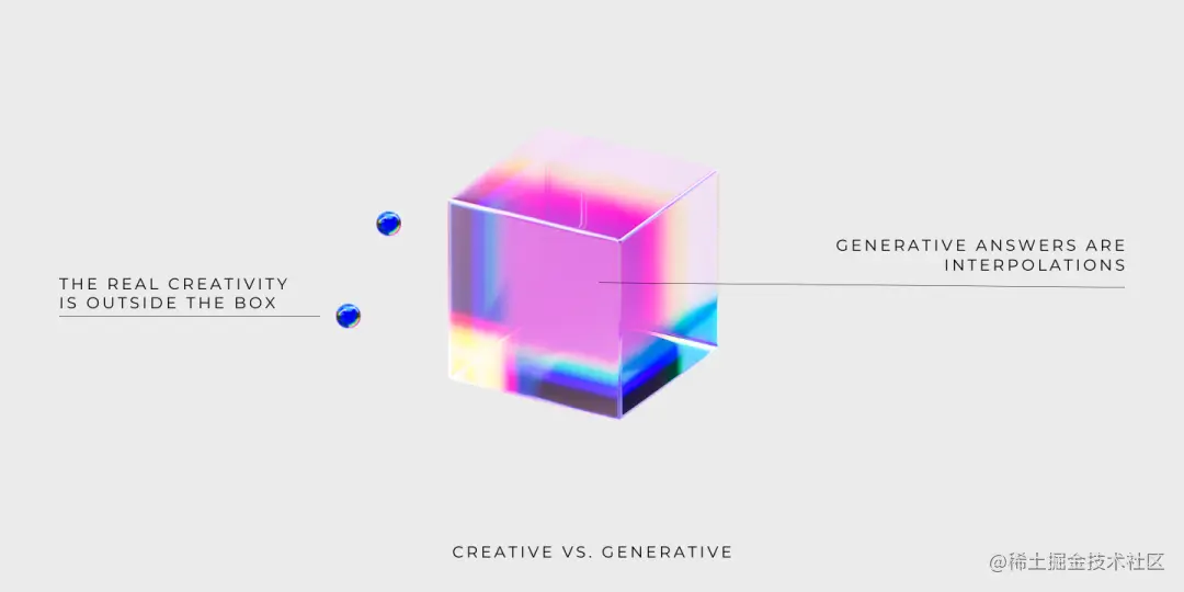 查询时,LLM 返回的答案是从包含训练数据的流形中获取的。虽然模型学习到的流形可能很大并且很复杂,但是 LLM 只是提供训练数据的插值后的答案。LLM 遍历流形并提供答案能力并不代表创造力,真正的创造力是学习流形之外的东西。
