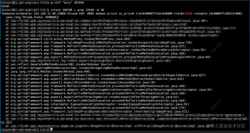 然后确定线程id,再通过如下命令计算十六进制值:printf "%x\n" ,假设输出为32af5 然后,再使用如下命令,打印该线程堆栈100条内容 jstack | grep 32af5 -A 100 如jstack 196788 | grep 32af5 -A 100